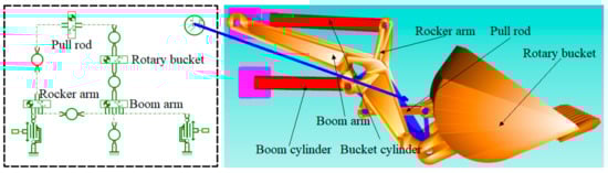 The research object of the paper is a 50-type wheel loader. It is a Chinese loader model with a rated load of 5 t, according to the two-dimensional drawings acquired from the manufacturer to obtain the specific dimensions of each component and the location of the articulated point between the cylinder and the frame []. The parameters of the actuator are shown in Table 2. The AMESim 2D mechanical library is used to build the loader actuator simulation model, as shown in Figure 7, for subsequent research.