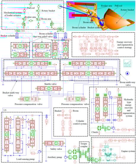 In recent years, the demand for advanced energy-saving technologies has increased with the increasingly stringent vehicle emission standards and rising energy costs in every country []. Loaders have a wide range of applications and are one of the primary construction vehicles, with significant ownership [,]. In the operation process of frequently loading and unloading materials, the boom cylinder of loaders performs a series of periodic and repetitive actions. A large amount of boom arm potential energy is converted into thermal energy through a multi-way valve []. This results in a significant rise in hydraulic oil temperature, which directly deteriorates the regular operation of the loader in severe cases. Therefore, the energy recovery and regeneration of the potential energy of the loader boom arm can not only effectively solve the problem of the rapid rise in hydraulic oil temperature but can also reduce the fuel consumption of the loader engine.