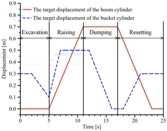 The cylinder control signal is set as shown in Figure 10. The system completes a complete typical working condition in 25 s. According to the displacement set by the boom and bucket cylinders, the system completes the excavation action between 0 and 5 s. The system completes the raising action between 5 s and 11 s. The system completes dumping action between 11 s and 17 s. The system completes the resetting between 17 s and 25 s. The system simulation time is set to 75 s, i.e., three working actions are completed in typical working conditions. Combining the above Section 3.3 and Section 3.4 analyses and the information provided by the 50-type wheel loader manufacturer, the system simulation parameters are set, as shown in Table 4.
