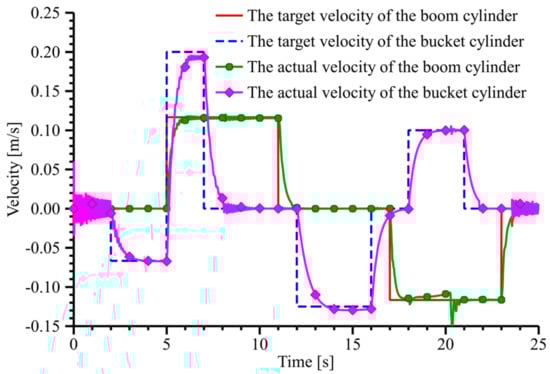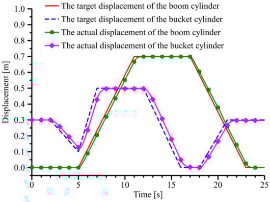 Figure 11 shows the cylinder displacement curves. Figure 12 shows the cylinder velocity curves. Since the system adopts the PID controller for feedback control, the boom and bucket cylinder displacement and velocity can better track the boom and bucket cylinder’s target displacement and velocity. When the boom cylinder and bucket cylinder’s target displacement and velocity change, the boom cylinder and the bucket cylinder’s displacement and velocity fluctuate less. In summary, the hybrid system actuator is responsive and can meet the regular operation needs of the loader.