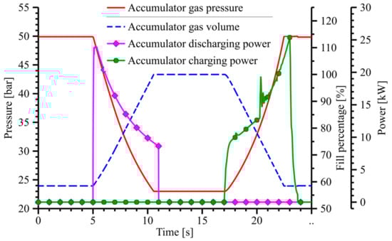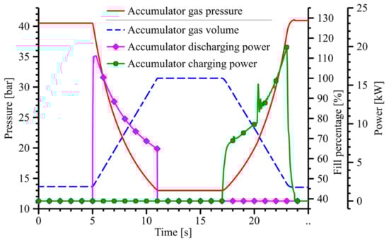 Figure 13 shows the accumulator gas pressure, volume, and power curves. The system performs energy regeneration between 5 s and 11 s. The accumulator gas pressure reduces from 40.6 bar to 13 bar. The accumulator gas fill percentage increases from 45% to 99.8%. The accumulator discharges power reduces from 18.7 kW to 6.8 kW. The system performs energy recovery between 17 s and 23 s. The accumulator gas pressure increases from 13 bar to 40.8 bar. The accumulator gas fill percentage reduces from 99.8% to 44.9%. The accumulator charges power increases from 7.1 kW to 20 kW.
