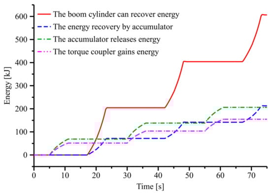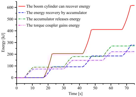 The system energy recovery and regeneration curves can be obtained from Equations (3) and (5) combined with the system simulation model, as shown in Figure 14. The total recoverable energy of the boom cylinder is 610.2 kJ, the total recover energy of the accumulator is 216.7 kJ, and the energy recovery efficiency of the system is 35.5%. The total energy released by the accumulator is 210.4 kJ, the total energy gained by the torque coupler is 156.5 kJ, and the energy regeneration efficiency is 74.4%.