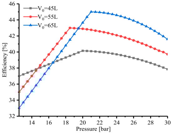 Based on the simulation model and combined with Equation (6), keeping other system parameters constant. The accumulator filling pressure is set to 12.5 bar to 30 bar, and the system energy recovery efficiency is analyzed under the rated volume of the accumulator at 45 L, 55 L, and 65 L. Figure 15 shows the accumulator variable filling pressure energy recovery efficiency curves. The energy recovery efficiency of the system shows a rising and then decreasing trend as the accumulator filling pressure rises. As the volume of the accumulator increases, the system energy recovery efficiency gradually increases. Therefore, the system can improve energy recovery efficiency by increasing the accumulator filling pressure.