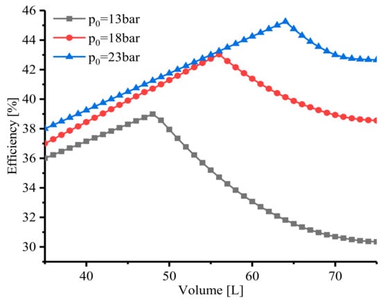 Similarly, keeping the system’s other parameters unchanged, the accumulator’s volume is rated at 35 L to 75 L. The energy recovery efficiency of the system is analyzed under the accumulator filling pressure of 13 bar, 18 bar, and 23 bar. Figure 16 shows the accumulator variable volume energy recovery efficiency curves. The energy recovery efficiency of the system shows a rising and then decreasing trend as the rated volume of the accumulator rises. As the accumulator filling pressure increases, the system energy recovery efficiency gradually increases. Therefore, the system can improve energy recovery efficiency by increasing the rated volume of the accumulator.