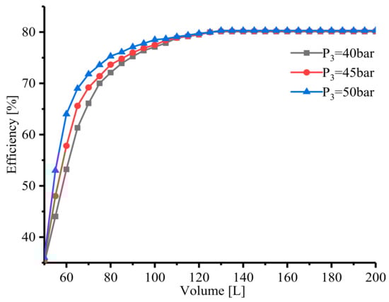 Similarly, keeping the system’s other parameters unchanged, the energy regeneration hydraulic motor displacement is rated at 50 mL/rev to 200 mL/rev. Furthermore, we analyzed the energy regeneration efficiency of the system under the working pressure of 40 bar, 45 bar, and 50 bar after energy recovery from the accumulator gas. Figure 17 shows the energy regeneration hydraulic motor variable displacement energy regeneration efficiency curves. The energy regeneration efficiency of the system shows a rising and then maintaining trend as the hydraulic motor displacement rises. When the hydraulic motor displacement rises to 130 mL/rev, the working pressure after the accumulator energy recovery is not affected by the energy regeneration efficiency. Therefore, the system can improve the system energy regeneration efficiency by increasing the energy regeneration through hydraulic motor displacement.