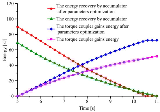 Figure 19 shows the comparison curves of accumulator recovery and regeneration after parameter optimization. Before the parameter optimization, the energy recovered by the accumulator was 69.2 kJ, and the energy gained by the torque coupler was 51.8 kJ. After the parameter optimization, the energy recovered by the accumulator is 90.1 kJ, and the energy gained by the torque coupler is 72.4 kJ. The energy recovered by the accumulator is increased by 20.9 kJ, and 22.6 kJ increases the energy gained by the torque coupler.