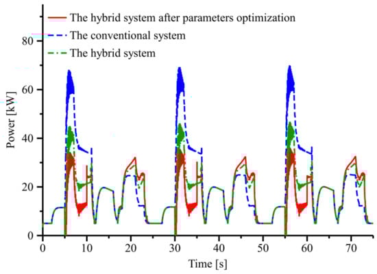 Figure 21 shows the engine power comparison curves. The maximum engine power of the conventional system, the hybrid system, and the hybrid system after parameter optimization is 67.7 kW, 43.5 kW, and 38.9 kW, respectively, when the boom arm rises between 5 s and 11 s. The maximum engine power is reduced by 35.7% before the parameter optimization and 42.5% after the parameter optimization of the hybrid system compared to the conventional system. The engine’s maximum power is reduced by 6.8% after parameter optimization. When the boom arm drops, the accumulator is charged between 17 s and 23 s. The pressure of the accumulator gas gradually increases during the charging process, increasing the pressure of the piston side of the boom arm cylinder, which increases the outlet pressure of the load-sensing pump. Since the output flow rate of the pump is constant, the pump’s output power increases, leading to an increase in engine output power. In summary, the hybrid system can effectively reduce the engine power when the boom arm rises.