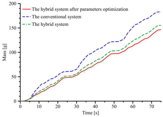 The engine fuel consumption from Equation (1) is shown in Figure 22. The engine fuel consumption of the conventional system, the hybrid system, and the hybrid system after parameter optimization is 183 g, 155.3 g, and 146.2 g, respectively. The hybrid system reduces fuel consumption by 15.1% compared to the conventional system. The hybrid system reduces fuel consumption by 20.1% after parameter optimization. Therefore, the engine fuel consumption is reduced by 5% after parameter optimization. In summary, the hybrid system can effectively reduce the engine fuel consumption.