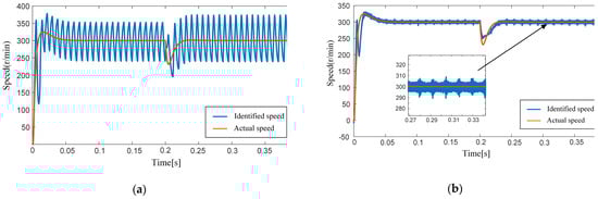 Figure 9 shows the resistance identification of the adaptive SMO under a 7 us dead time, both before and after the improved linear dead time compensation. The motor resistance is changed from 1.68 to 3 Ω at 0.2 s. It can be seen from Figure 9a that there is a large error in resistance identification without dead zone compensation. After introducing dead zone compensation in Figure 9b, the resistance identification error is within 0.05 Ω, which demonstrates that the dead zone has a significant impact on the accuracy of resistance identification. At the same time, the improvement of linear dead zone compensation can significantly improve the accuracy of online resistance identification. In [21], the second-order sliding mode observer (STA-SMO) with the supertorsion algorithm is used to estimate the stator resistance (Rs) and rotor position information online, in order to consider the influence of the dead zone. In this paper, the dead zone effect was considered and the improved nonlinear dead zone compensation was adopted. In [21], the resistance of the motor is 2.785 Ω, and the resistance error identified by STA-SMO is about 0.2 Ω. According to the above results, the resistance identification accuracy of the observer designed in this paper is higher than that in [21].
