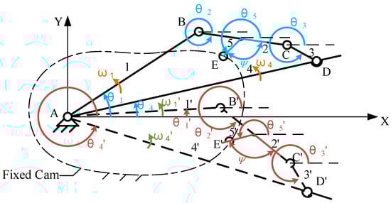 In general, the objective of the cam five-bar mechanism is to achieve a controlled change of the rotational angular speed with the rotation angle. As illustrated in Figure 1, the cam five-bar mechanism is composed of one cam and five bars. Rod 1 is the prime mover, whose angular velocity is constant. Rod 4 is the output member, whose angular velocity is supposed to meet working requirements. In addition, rods 2 and 5 are fixedly connected. Rods 2 and 3 generate the triangle BCD. During the system operation, the angle BCD would be changed if the motion state of rod 2 is adjusted through the cam. Correspondingly, the distance between B and D is also changed. As a result, the movement of the output member (i.e., rod 4) can be determined by adjusting the distance between B and D.