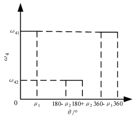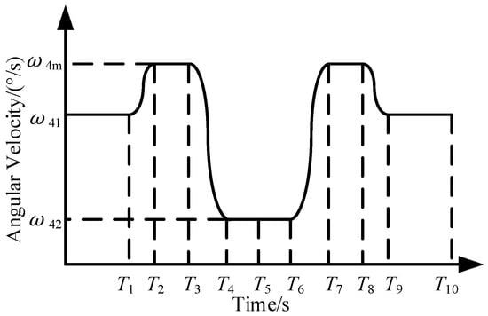 First of all, a combination of five straight lines and four curves is introduced for the representation of ω4, which is depicted in Figure 3. Specifically, the angular velocity of the 0~T1, T4~T6, and T9~T10 periods are given in advance. Therefore, the remaining curve is divided into two parts. The first part is the T2~T3 and T7~T8 periods, while the second is the period of T1~T2, T3~T4, T6~T7, and T8~T9. In particular, the angular velocity keeps constant in the first part, whereas the second part (i.e., the buffer section) introduces a motion law curve as the corresponding angular velocity curve. The integration of ω4 in the 0 to T10 period is 360°.