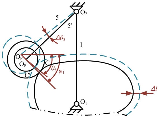 Ideally, the cam and the roller are in tangential contact at point C. However, the point would change from C to C′, when Δl and rg are taken into account. Then, the angular error Δθ5 of rod 5 is calculated as: