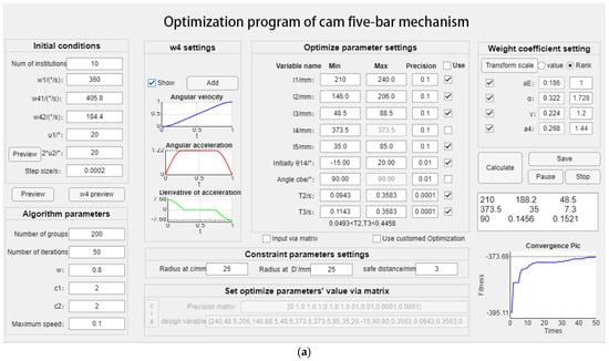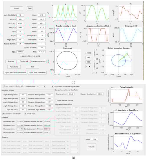 In addition to the theoretical analysis, this paper proposes a computer-aided design platform to assist the design analysis of the cam five-bar mechanism, which is developed based on MATLAB. As depicted in Figure 7, the software package is composed of three modules: optimization, parameter calculation, and reliability analysis.