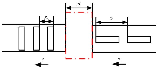 Corresponding to the physical structure, the working diagram of the production line is shown in Figure 9. Initially, the products are placed horizontally on the first conveyor, moving with speed v1. x1 is the spacing between products on the first conveyor. During the system operation, the intermediate mechanism (i.e., the transverse device, width: d) would pass the products from the first conveyor to the second conveyor, with the placement changing from horizontal to vertical. Accordingly, the spacing and moving speed are changed to x2 and v2, respectively.