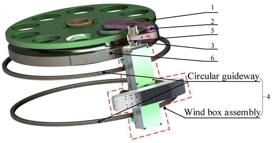 According to the working requirement of the production line, a cam five-bar mechanism is developed for the transverse device. As shown in Figure 10, the cam five-bar mechanism consists of a linkage mechanism 1-2-3-4 and a cam mechanism 5-6, where member 1 is a rotating disc, member 2 is a rocker arm, and member 3 is a linkage. Output member 4 is composed of a wind box assembly and a circular guideway.