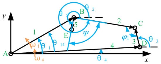To find the final solution, i.e., the trajectories of points A, B, C, D, and E, the values of l1, l2, l3, l4, l5, Ψ, ω4, and ω1 and the initial value of θ14 (the angle between rod 1 and rod 4) need to be determined. In real practice, ω4 is usually given as ω41 and ω42, which is shown in Figure 2. The connection curve between ω41 and ω42 can have many choices. The angular velocity ω4 is completely determined only after selecting the connection curve concerning the actual working condition requirement.