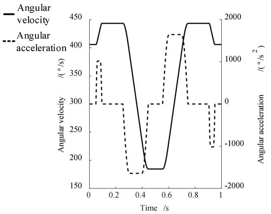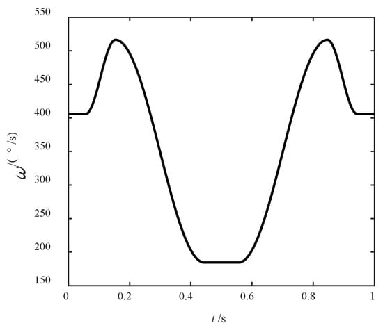 According to the working requirements, the ω41 and ω42 are determined as 405.75°/s and 184.43°/s, respectively. A dwell-free modified iso-velocity curve [] is adopted in the buffer section. Then, the motion law of the output member is obtained, as shown in Figure 12.
