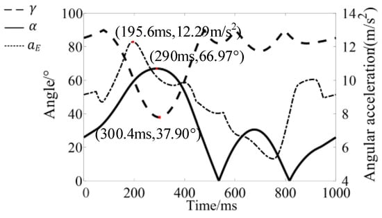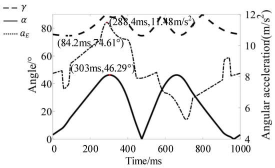 In Figure 15, γmin is 74.61°, αmax is 46.29° and aEmax is 11.48 m/s2. Compared with Figure 13, the relevant performance parameters are optimized. The new motion characteristics meet the design requirements (i.e., γmin ≥ 40° and αmax ≤ 50°).