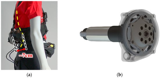 Though the exosuit type of a wearable robot has several merits over the exoskeleton type, it still has limitations, especially in the aspects of size and control performance. Considering the HE, which is said to be the current state-of-the-art exosuit, the design of the device is still heavy and bulky because the actuation system was not custom-made for the robot. Two commercial motors in the shape of a long cylinder with a pulley in the shape of a flat disk for driving the Bowden cable were used for the actuation system [5]. Because the motor and pulley were designed to be coaxial, the resulting actuation system was quite bulky, with the actuation system extruding up to 7 cm from the back of the wearer, as illustrated in Figure 1.