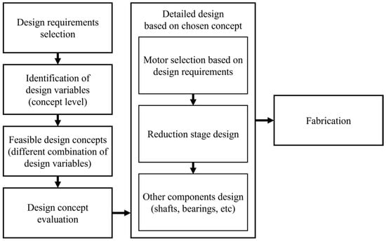 In this chapter, the design process for the new actuator is described. First, the design requirements for the actuator are chosen. Secondly, the design variables that can be altered in the concept design are defined, and feasible design concepts are suggested by choosing different combinations from these design variables. The design concepts are evaluated, and the concept that best matches the goals and requirements of the actuator is selected. Based on the selected design concept, detailed designs are made, such as selection of the motor, reduction stage, and other mechanical component design. These steps for the design process are shown in Figure 2.