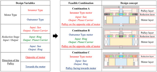 To design the new actuator for exosuits that maximizes the advantages of the QDD type actuators, several design concepts of cable-driven actuators based on QDD were evaluated. The design concepts were made by varying the types and positions of the three crucial components; base motor, reduction stage, and pulley. Only the designs that could potentially meet the requirements while keeping the actuator in the shape of a flat cylinder were considered. Therefore, the reduction stage was considered in the form of a single-stage planetary gear set. After exploring the possible combinations of designs for each component, three design concepts were selected and comparatively evaluated, as presented in Figure 3, to select the optimal design for the actuator.
