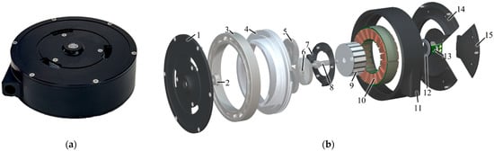 PEQDD prototype (a) Manufactured and (b) Exploded view of PEQDD. 1. Front cover, 2. Sun gear bearing, 3. Ring gear bearing, 4. Pulley integrated ring gear, 5. Planet gear, 6. Planet gear bearing, 7. Planet gear carrier, 8. Sun gear shaft, 9. Rotor, 10. Stator, 11. Middle cover, 12. Encoder–Magnetic ring, 13. Encoder–Reading head, 14. Bottom cover, 15. Removable bottom cover.