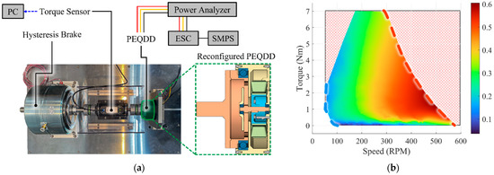 Testbed setup and efficiency map of PEQDD (a) Dynamometer testbed setup to measure the steady-state performance of PEQDD. (b) Energy efficiency map of PEQDD at steady-state condition. The area marked red is out of operation range.