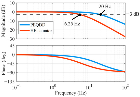 We compared the control bandwidth of the PEQDD and the actuator used in the HE, with the position closed-loop condition using a tunning program (Elmo Application Studio II, Elmo Motion Control Ltd., Petah Tikva, Israel) and motor controller (Gold Solo Twitter R50/100, Elmo Motion Control Ltd., Petah Tikva, Israel). By using the automated identification tool, which was built-in to the tunning program, we applied 100% continuous current to both actuators in no-load conditions. Motion to rotate the pulley for 1 rev was generated, using frequencies between 0.1 and 100 Hz. As shown in Figure 6, the cut-off frequency of the PEQDD was 20 Hz, whereas the Maxon was 6.25 Hz. Through the increase of the cut-off frequency, we can expect an increase in the controllability of the force controller. This increase in control performance will better relieve the delay of force transmission between the actuation system and the human body.