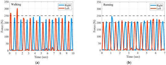 Figure 8a,b present data of 10 strides within the measured data of 2 min during walking and running, respectively. As shown in Figure 8, the peak force was mostly stable within the target range. The peak force on the left and right leg during walking was 232 ± 3.47 and 235 ± 9.28 N (mean ± Standard Error of the Mean: SEM), respectively, and peak force on the left and right leg during the running was 215 ± 3.90 and 210 ± 2.98 N (mean ± SEM), respectively. For some of the strides during walking, an intermittent peak force of over 300 N was delivered. From this, we can infer indirectly that the PEQDD can potentially deliver forces over 300 N, which was set as the design requirement. The maximum speed of the pulley rotation during walking and running conditions were 301 RPM and 341 RPM, respectively.