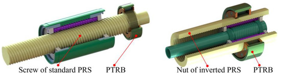 Two integration schemes, i.e., planetary thread roller bearing (PTRB) and planetary roller screw (PRS), need to be introduced before the description of IEMM. As mentioned in the authors’ earlier paper [22], PTRB has certain advantages over the common high-quality bearing products, such as small volume, high bearing capacity, no need to be used in pairs or combinations, and the ability to carry axial-radial combined load and bidirectional axial load. Moreover, since the structure of PTRB evolved from PRS and the two have many similarities in processing mode, they can be processed by the same factory [22]. Therefore, with the optimization of the overall structure and the improvement in processing ability, PTRB and PRS can be integrated. The integrated assembly can bear bilateral axial tension and compression loads and reduce the number of system parts and components and the overall weight, further improving the power-to-weight ratio and the level of integration. The first integration scheme is shown on the left of Figure 1. Multiple parallel and evenly spaced rings of annular threads are machined on the shaft at the screw end of a standard PRS, and such annular threads serve as the inner ring of PTRB to install PTRB on the screw of PRS. The second integration scheme is shown on the right of Figure 1. Multiple parallel and evenly spaced rings of annular threads are machined on the nut outer ring of a inverted PRS, and such annular threads serve as the inner ring of PTRB to install PTRB on the nut of PRS.