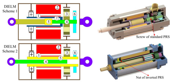 The structural composition and transmission scheme of DIELM are shown in Figure 2. There are two DIELM schemes due to different integration modes between a frameless motor and PRS. Scheme 1 is to integrate the permanent magnet patch of the frameless motor with the nut of the PRS through a rotating sleeve. Scheme 2 is to integrate the permanent magnet patch of the frameless motor with the screw of the PRS. DIELM has a similar structure to the integrated electro-mechanical actuator (IEMA) proposed in one of the authors’ previous papers [23], and DIELM integrates PTRB and PRS on the basis of IEMA [23]. Compared with IEMA, DIELM has fewer parts or components, so that the integration level of the module is improved, the volume is reduced, and the assembly and debugging processes are streamlined. DIERM has a simple structure that only integrates the servo motor, PTRB and sensor, no more details are provided in this paper.