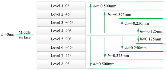 There are many lay-up models for the laminate. To obtain high-performance laminates, a symmetric and balanced lay-up model [0°, 45°, −45°, 90°]s that only produces in-plane strain without a warping phenomenon was preliminarily adopted in this paper. The thickness and angle of each single layer of laminate were as shown in Figure 3.