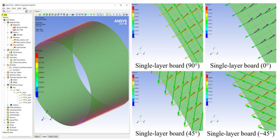 A CFRP cylinder with an inner diameter of 89 mm, an outer diameter of 91 mm, and a length of 60 mm was taken as an example. Ansys workbench was used to analyze the strength of the CFRP laminate. The Tsai–Wu failure criterion, the one most consistent with the experimental data, and the relatively conservative first layer damage design criterion were used as the criteria for determining whether the CFRP laminate fails [24,25].