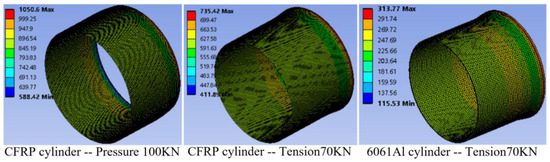 External load and Tsai–Wu failure criterion were added to the mechanical module [24,25]. Then a strength simulation analysis was conducted to obtain the stress nephogram of CFRP cylinder under an axial compression load of 100 KN and an axial tension load of 70 KN, as shown in Figure 5. According to the failure criterion, the CFRP cylinder did not reach the damage state, with the maximum stress of 1050.6 MPa and 735.4 MPa, respectively. Meanwhile, a strength simulation analysis was also conducted on the cylinder made of aluminum alloy 6061. Under an axial tension load of 70 KN, the maximum stress of aluminum alloy 6061 reached 313.8 MPa, but its yield strength was only 280 MPa. That is, under an axial compression load of 100 KN or an tension load of 70 KN, the aluminum alloy 6061 cylinder yielded. Since the density of CFRP was smaller than that of the aluminum alloy, the CFRP cylinder of the same size had a smaller weight.