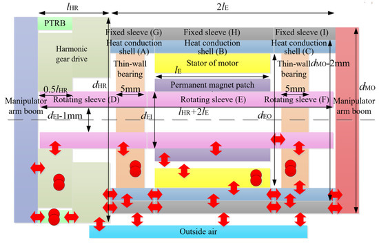 The inner wall of the rotating sleeve is connected to the hollow manipulator’s arm, and it can be approximately considered that dry air at a constant temperature exists on the inner wall of the rotating sleeve. According to the Dittus–Boelter equation, the in-tube convective heat transfer coefficient between the inner wall of the rotating sleeve and the air is expressed as follows [40]: