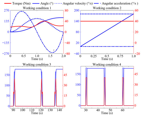 Working condition 1: to avoid the sudden change of GIERM in torque and angular velocity during operation, the polynomial interpolation is used to plan the trajectories of the manipulator to obtain smooth torque, angular velocity, and angular acceleration curve.