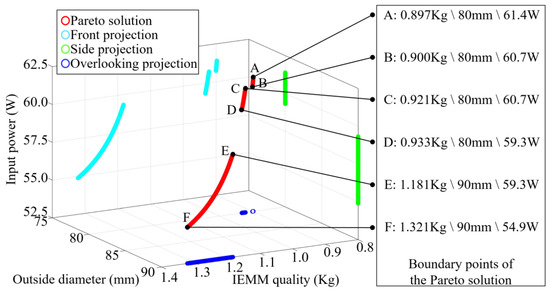 The design variables and the constraint conditions have been explained in Section 5.1. After the relevant parameters were calculated according to Formulas (3)–(21) and the constraint conditions and range of parameters were set, multi-objective optimization design was carried out on GIERM under working condition 1. The population quantity and number of iterations were set to 10,000, the Pareto population fraction was set to 0.1, and the Pareto solution set obtained is shown in Figure 10. As shown in Figure 10, the Pareto solution set was segmented. This is because, in the multi-objective optimization process, the outer diameter of the reducer matching with the motor was no less than the outer diameter of the fixed sleeve. That is, the outer diameter of IEMM always equaled the outer diameter of the reducer. Because of the jumping in the outer diameter of the reducer in the product manual, the Pareto solution set also had segments and jumping.