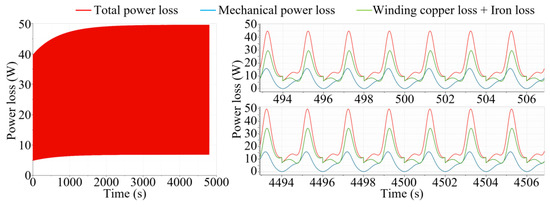 - When GIERM worked under working condition 1 for an uninterrupted 4800 s, the variation of power loss over time is shown in Figure 11. Based on the analysis of the load spectrum, in each cycle, the parameters of GIERM, such as torque and angular velocity, were constantly changing, resulting in the change of motor current and speed, which also caused the fluctuation of power loss in each working cycle. Though the output power of GIERM had no change, the power loss showed a gradually rising trend on the whole until it reached a steady state. This is because the copper loss of the stator winding was temperature-dependent. With a rise in temperature, the copper loss of the stator winding and the power loss both increased. When the temperature reached an equilibrium state, all the indexes tended to be stable.