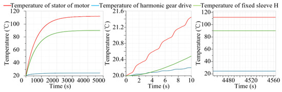 The variation in the temperature of the parts and components is shown in Figure 12. A stepwise rise could be seen in the temperature of the motor stator and reducer. The variation in the temperature of CFRP was relatively mild. The system temperature reached an equilibrium state at 3000 s. The temperature of the motor stator, reducer and CFRP stabilized at 112 °C, 25 °C and 90 °C, respectively. Through analysis, under working condition 1, the temperature of all parts could meet the requirements in either continuous working mode or intermittent working mode. Therefore, there is no need to add a heat-conducting shell.