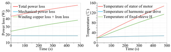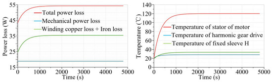 After the heat-conducting shell was added for GIERM and the thermal resistance of each part was calculated, a thermal simulation model for the GIERM with a heat-conducting shell was built in AMESim. Through continuous iterative calculations, an aluminum alloy U-shaped cylinder with a wall thickness of 2 mm was finally determined to be the heat-conducting shell, and its weight was 0.051 kg. As shown in Figure 14, the power loss and temperature increased steadily over time. The system temperature reached an equilibrium state at 1400 s. The temperature of the motor stator, reducer and CFRP stabilized at 120.0 °C, 28.2 °C and 33.6 °C, respectively, meeting the requirements.