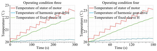 - A simulation analysis was carried out on the GIERM without the heat-conducting shell that worked under working conditions 3 or 4, and the variation of temperature over time is shown in Figure 15. Due to the non-continuous working system and short single working time, the temperature of all parts had a small and stepwise increase over time and met the requirements under both working conditions. Hence, there is no need to add a heat-conducting shell.