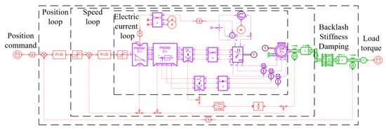 To analyze the dynamic performance of the GIERM design, a system simulation model was built in AMESim, as shown in Figure 17. Current feedback, velocity feedback and position feedback were introduced to realize the closed-loop control of the module. Rotating clearance, coupling stiffness and damping were considered at the output end of the GIERM to simulate the real working conditions [23].