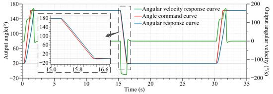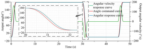 The dynamic performance simulation results of the module under working conditions 3 and 4 were obtained by setting the simulation time of a single working cycle and a sampling frequency of 1000 Hz, as shown in Figure 18 and Figure 19. According to the analysis of the simulation results, GIERM had a good position tracking effect, without obvious steady-state error, hysteresis error or position jitters. The rise time for unidirectional movement was less than 1.4 s, and the maximum speed was 176°/s. The module exhibited a relatively rapid response speed and good control accuracy.