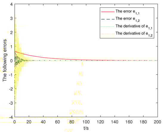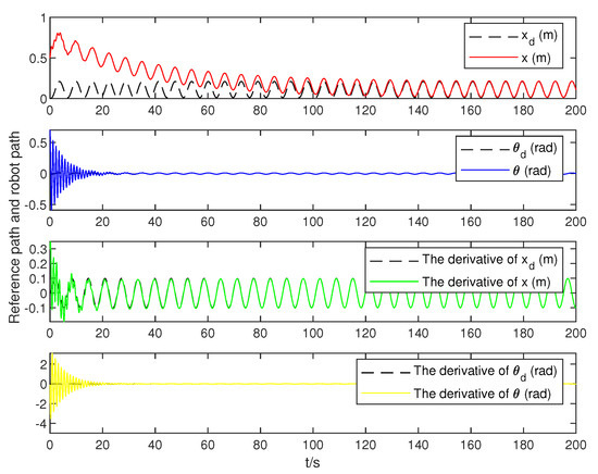 A simulation model of an agricultural cart-pendulum robot is exploited to examine that the raised control strategy has a suppressive effect on actuator attacks and model uncertainties in this section. According to [37], the parameters of the robot are selected as = 18.04 kg, = 4.06 kg, = 44.84 Ns/m, = 0.0015 Ns/m, l = 0.2 m, I = 0.14 kgm2. The starting path-following error is chosen by = [0.5; 0.7; 0.3; −0.1]. For actuator attacks simulated by the neural network (4), W = [−0.2; −0.5; −0.07; 0.1] is chosen as the unknown weight of the neural network. The non-ideal perturbation factor affecting the system is chosen as = 0.02sin(e(1)t).