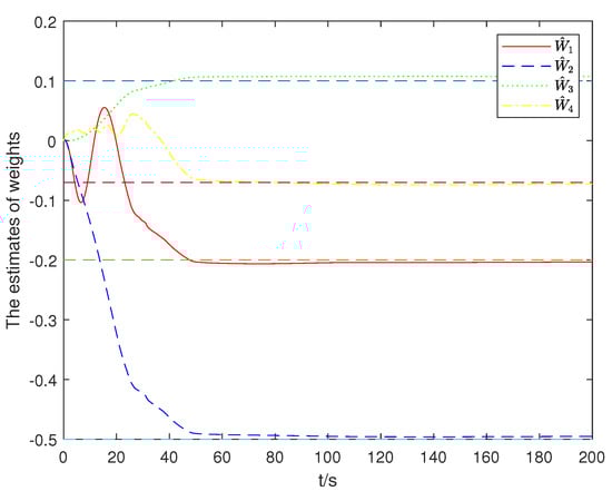 The dynamic Equation (15) of the filter is obtained by combining the dynamic Equation (11) of the tracking error system with the linear filters (12)–(14). In fact, the dynamic Equation (15) can be regarded as a virtual dynamic equation used only for calculation, and it does not represent any physical meaning. The main purpose of designing Equation (15) is to avoid using higher-order parameters to represent the estimation errors of weights. In the actual process, the real system tracking error equation and the filtered dynamic equation depend on each other and work simultaneously.