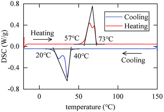It is known that SMAs are inevitably affected by a series of unpredictable deformations during the process of production and fabrication, and the unwanted detwinned martensite is induced in materials. Through high-temperature heat treatment, the detwinned martensite can be transformed into twinned martensite, i.e., the ‘forget memory’. The specific steps of heat treatment are as follows. Firstly, materials are restrained into a flat shape by the fixture. Secondly, materials are heated to 500 ℃ in an oven, and the heat treatment is completed after 30 min; the materials are then cooled down in the oven. Through these operations the residual stresses inside the materials can also be effectively eliminated [29,30]. After the heat treatment process, the materials can memorize a certain hot shape. Before the training for inducing the TWSME, the four characteristic temperatures associated with transformation need to be known, namely martensitic start transformation temperature (Ms), martensitic finish transformation temperature (Mf), austenitic start transformation temperature (As), and austenitic finish transformation temperature (Af). These characteristic temperatures of the above SMAs are measured using a differential scanning calorimeter (DSC). About 20 mg of the samples are cut out from the SMAs and placed in the DSC for treatment. The measurement result of the DSC is shown in Figure 1. There are two peaks during the heating and cooling process, which is due to the formation of the R-phase during the transformation between the martensite phase and the austenite phase. However, it is not affected by the subsequent training or deformation testing steps. The transformation temperatures in the DSC result are measured by plotting tangents on the transition peaks of the heating and cooling curves.