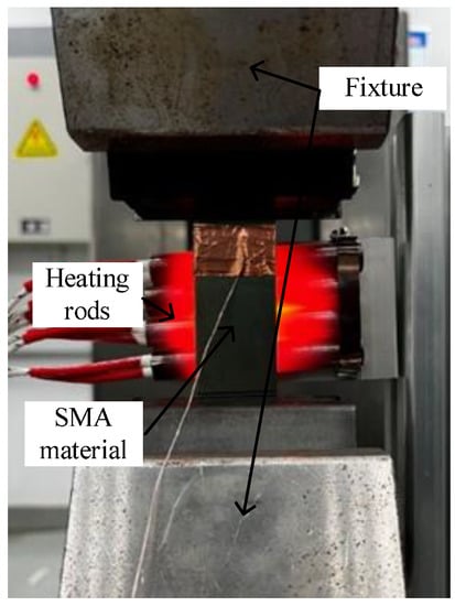 The loading process in Step 1 is performed on a UTM, which is provided by the Shenzhen SASTest Company, China. The maximum loading strain for the SMA strips is about 7%. Depending on the measured transformation temperatures of the materials, they will be trained in a temperature range of 0 to 140 °C in Step 2 and Step 3. A total of 20 training thermal cycles are applied for the SMA strips. The experimental training setup of the SMA strips is shown in Figure 3. Heating operation is achieved using heating rods behind the SMA strips. The power parameter of heating rods is 220V and 150W, at which the SMA strips can be heated to a fully austenitic phase within 2 min. The cooling operation is achieved using liquid nitrogen, which can cool the SMA strips to a fully martensitic phase as soon as possible.