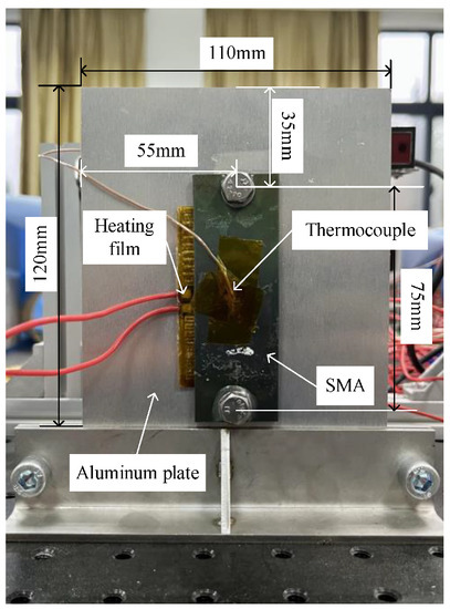 After the training process, the SMAs are cut through wire cut electrical discharge machining (WEDM) and installed on an aluminum plate to form an actuator structure. The length of the aluminum plate is 150 mm, its width is 110 mm, and its thickness is 1.5 mm. The size of the SMA strips used is also given, the length of the SMA is 86 mm, the width is 30 mm, and the thickness is 1.8 mm. Punch the bolt holes and bolt them together at the corresponding position of the SMA strip and the aluminum plate, and the distance between two holes is 75 mm. The deformation test platform is shown in Figure 5. A polyamide heating film is installed between the SMA and the aluminum plate. A K-type thermocouple is used to record the temperature changes on the SMA strip, and the deflection at the upper edge of the aluminum plate is recorded by a laser displacement sensor. In addition, experimental data are recorded by a computer.