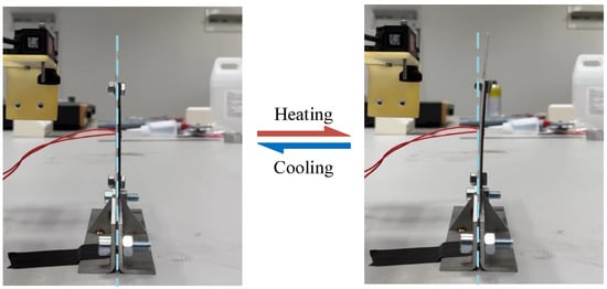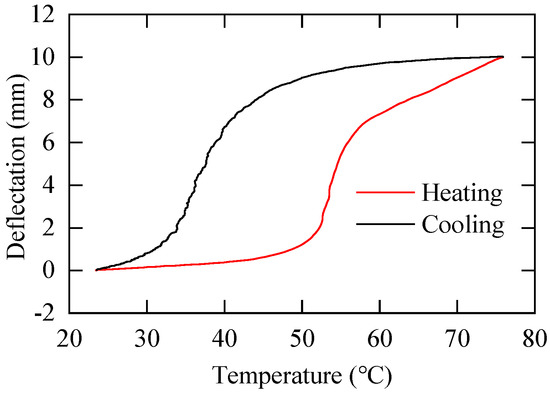 As is shown in Figure 6, the temperature range of the testing process is from 23 °C to about 76 °C, and a maximum deflection of approximately 10 mm can be achieved at the upper edge of the SMA-based actuator. Under the influence of the transformation temperature, the actuator starts to deform at about 50 °C in the heating process, and starts to recover to its initial shape at about 40 °C in the cooling process. Hysteresis phenomenon during the test process can be seen in the temperature–deflection curves. The deformation process of the SMA-based actuator is shown in Figure 7 and the whole deformation process takes 20 s.