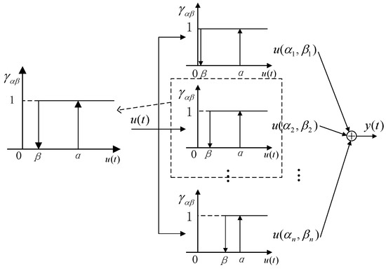 In 1935, Ferenc Preisach proposed a hysteresis model that could be used to precisely describe hysteresis behavior [33], which can describe all rate-independent hysteresis phenomena and is characterized by an easy identification and a simple mathematical formulation. The Preisach model can be described by a summation of a series of hysteresis operators and weight functions, whose expression is the double integral of products of the hysteresis operators and weight functions. The hysteresis operation is a rectangular loop with α and β as the maximum and minimum value, which is shown in Figure 8, and the value range of hysteresis operators is (0, 1). When the input value is greater than α, is equal to 1; when it is less than β, is equal to 0; when it is between α and β, the value of is determined by the change process of the input value. The calculation process of the Preisach model is also shown in Figure 8, where u(t) is the system input value, and y(t) is the system output value.